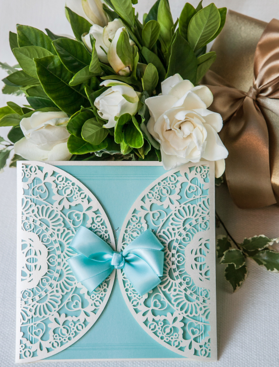 外卡以白色紙張精細雷雕,襯上Tiffany blue 對折卡片打凸邊框,內卡內頁內文燙金,中間綴以Tiffany blue緞面蝴蝶結。