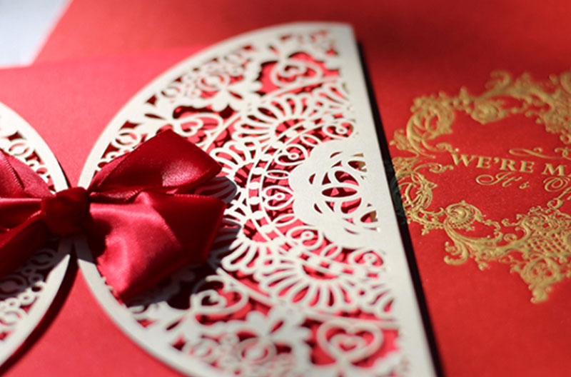 外卡以白色紙張精細雷雕,襯上紅色對折卡片打凸邊框,紅色內卡內頁內文燙金